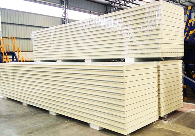本公司引進(jìn)意大利連續(xù)生產(chǎn)線,利用聚氨酯( PU.PIR )的物理特性及獨(dú)特配方,將聚氨酯發(fā)泡劑均勻噴覆在彩涂鋼板上,使發(fā)泡劑在彩涂鋼板之間發(fā)泡成型成為三層一次性成型的聚氨酯( PU.PIR )彩鋼復(fù)合夾芯板。這種新的輕型建材是彩涂鋼板與聚氨酯的完美結(jié)合,是輕型建材的發(fā)展方向。